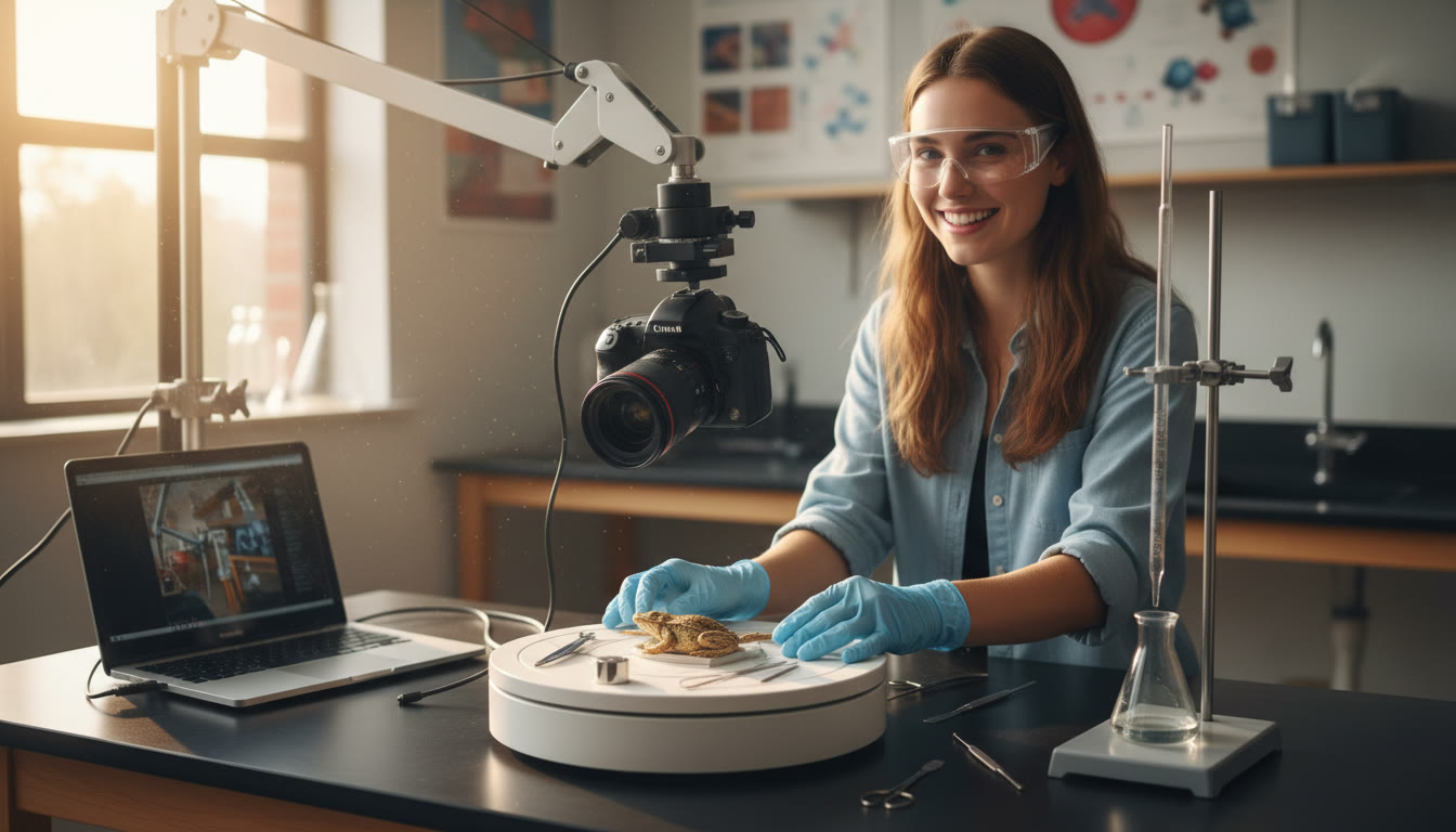 Photo Idea : A student wearing gloves and safety glasses arranging a turntable with small tools and a camera mounted overhead, capturing a step-by-step rotation of a biology dissection or a chemistry titration setup.