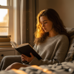 Photo Idea : A peaceful scene of a student resting on a couch with a soft blanket and a closed test booklet nearby — conveys relief and recovery.