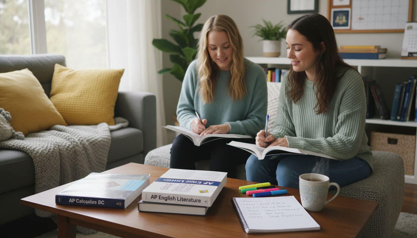 Photo Idea : A cozy study nook with two open textbooks, a notepad with a manageable weekly plan, and a cup of tea—visualizing calm, focused work on two AP courses.