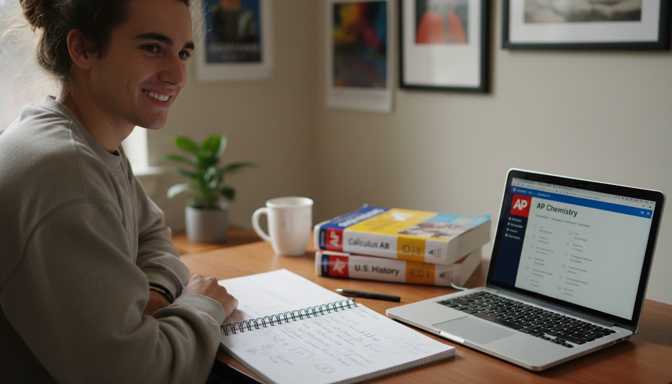Photo Idea : A focused student at a study desk with an open notebook, AP review books, and a laptop showing practice questions—soft natural light, calm expression.