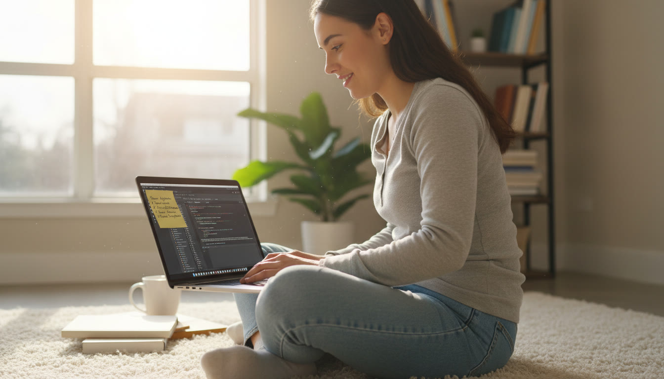 Photo Idea : Student sitting at a laptop with code on the screen and a sticky note checklist — natural daylight, relaxed focus, implying planning and review (place near the top of the article to set the scene).