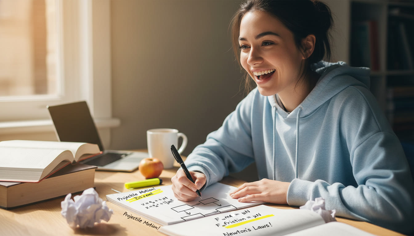Photo Idea : A student at a desk drawing a simple flowchart on paper with equations around it — kinematics on one side, forces on another. Bright, natural lighting, annotated with quick notes and a highlighter.