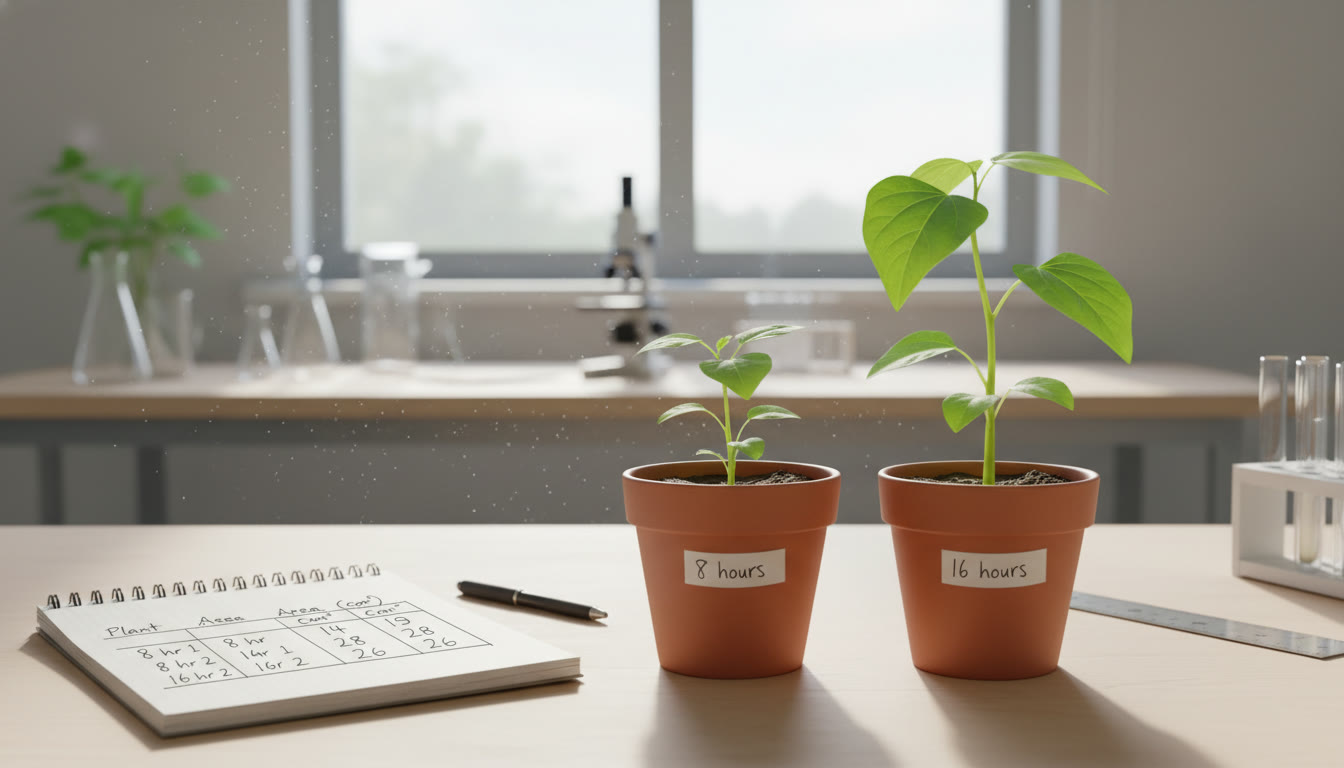 - Independent Variable (IV): The thing you change intentionally. In the plant example, light duration (8 vs. 16 hours).