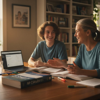 Photo Idea : A candid shot of a parent and high school student reviewing an AP study guide together at the kitchen table, warm afternoon light, laptop open with a school portal visible in the background.
