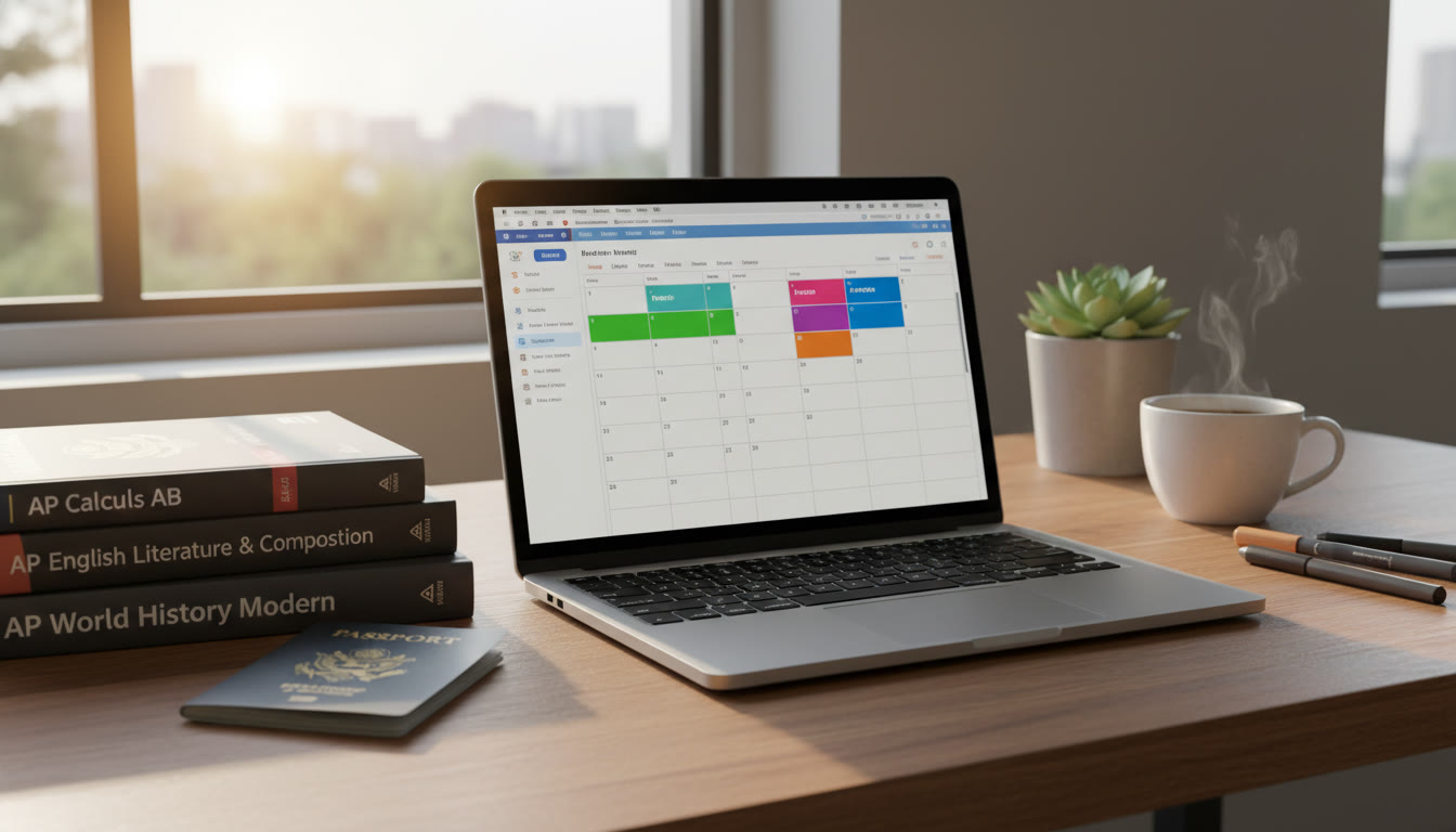 Photo Idea : A calm, sunlit desk with AP textbooks, a laptop showing a study plan, and a passport peeking out—symbolizing the intersection of serious study and travel or life experience.