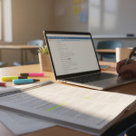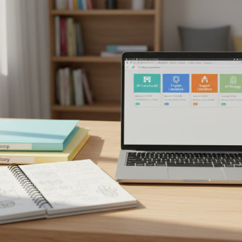 Photo Idea : A focused study scene showing a student using a laptop with AP practice questions on screen, textbooks stacked with post-it notes, and a tutor’s notes beside them—this image should appear near the end of the article to illustrate practical study in action.
