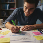 Photo Idea : A student at a wooden desk drafting an essay with annotated books spread out — a candid shot that suggests focused revision and the messy, rewarding work of writing.