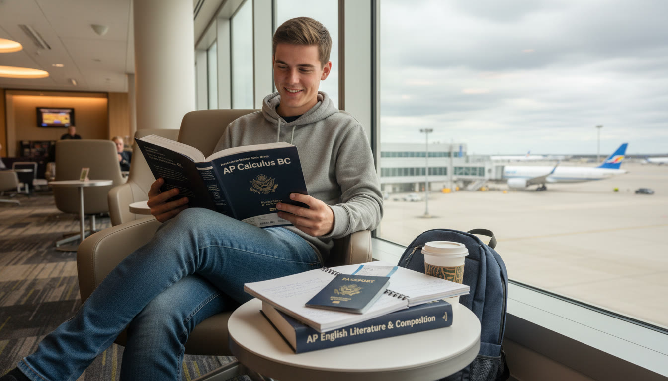 Photo Idea : A calm, focused student studying in an airport lounge with AP books and a passport visible, suggesting travel for a test day.