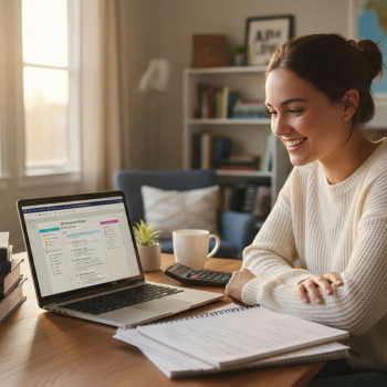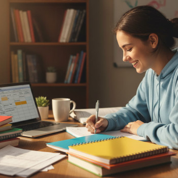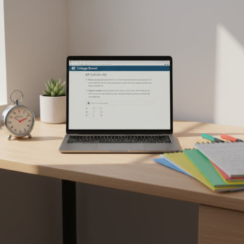 Photo Idea : A bright, candid photo of a high school student smiling while reviewing AP score report on a laptop, with sticky notes and a college planner on the desk—conveys planning, confidence, and clarity.