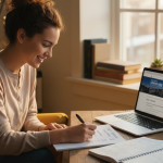 Photo Idea : A warm, storytelling image of a student in a small study session with a tutor, both smiling over a laptop showing a study plan. The scene should suggest personalized coaching, motivation, and step-by-step progress.