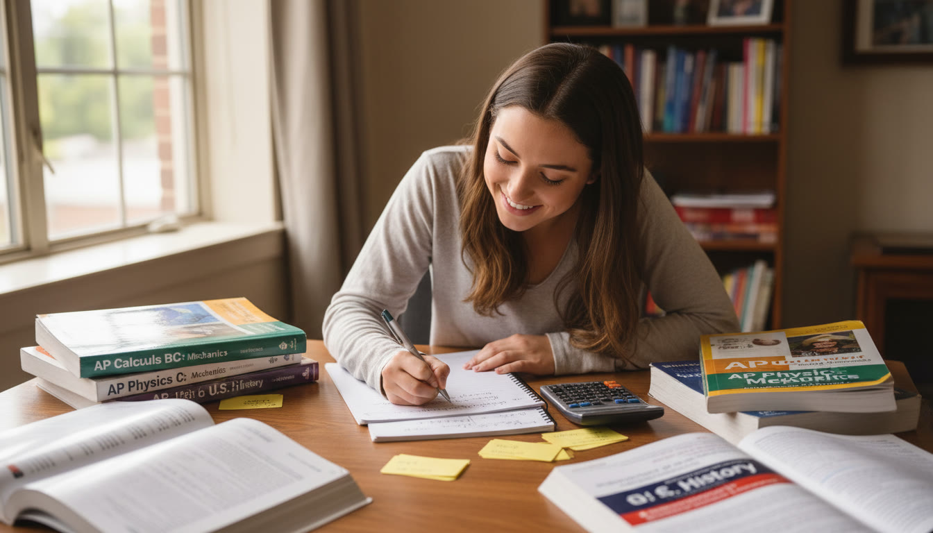 Photo Idea : A student at a desk surrounded by open AP textbooks and a calculator, mid-conversion on a scratch sheet. Natural light, calm focus.
