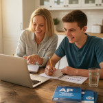 Photo Idea : Close-up of a student studying with AP materials and a tutor via laptop—connotes focused prep, one-on-one guidance, and digital study tools.