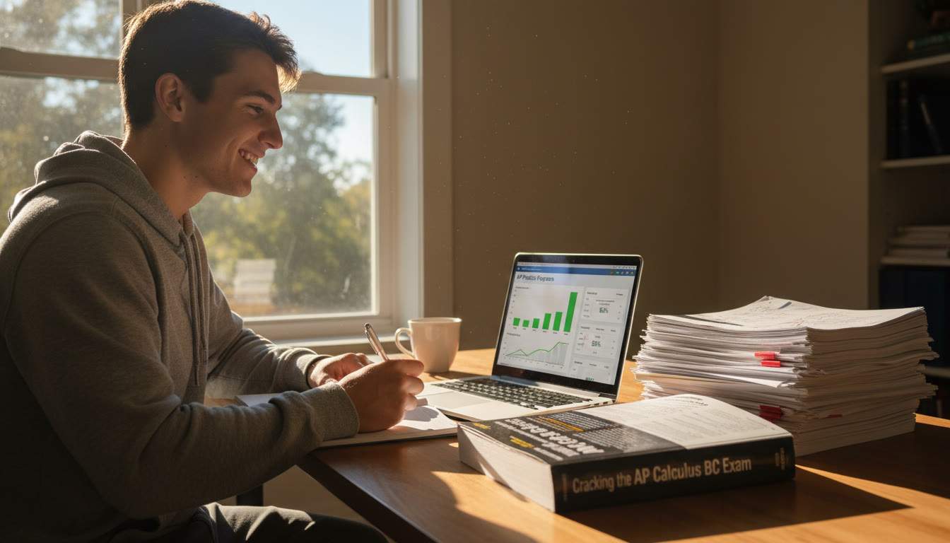 Photo Idea : A focused student sitting at a desk with a stack of mock papers, an AP prep book, and a laptop showing practice analytics — natural light pouring in through a window to evoke concentration and calm.