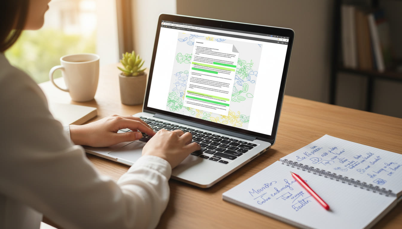 Photo Idea : close-up of a laptop screen showing a highlighted similarity report with teacher’s handwritten notes nearby