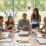 Photo Idea : Group of students discussing revision notes around a laptop with sticky notes and a timeline on the wall