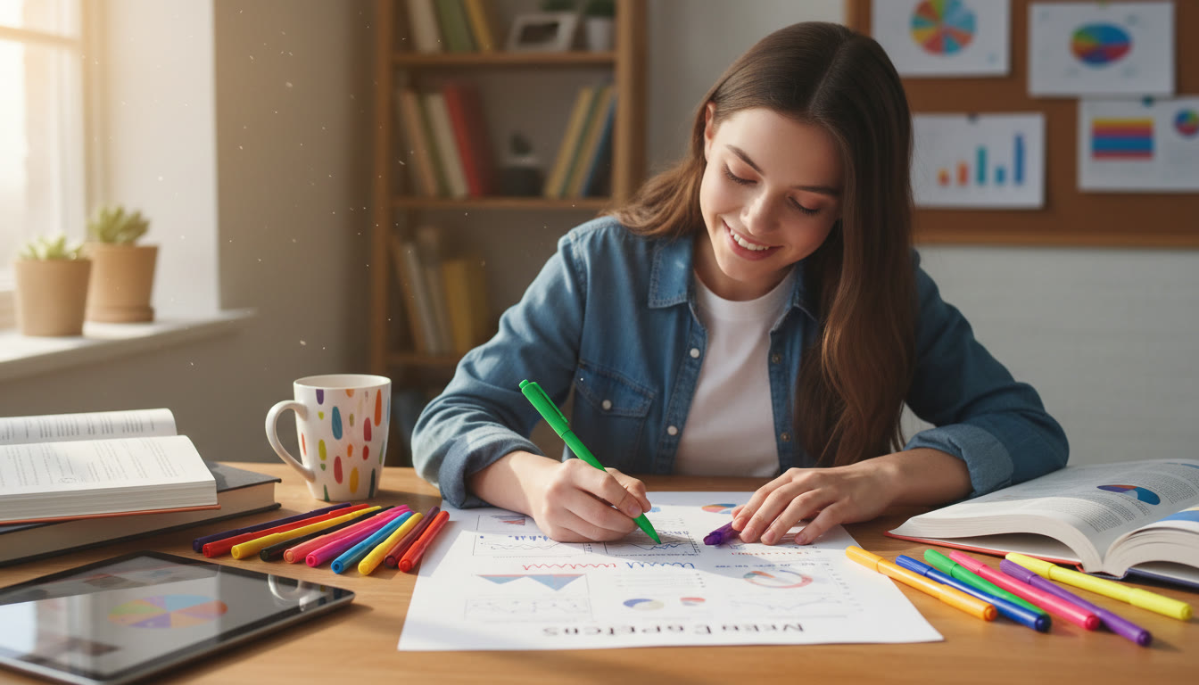 Photo Idea : A student annotating a printed exam paper with colorful pens, highlighting key words and rubric phrases