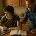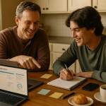 Photo Idea : A parent and student at a kitchen table, smiling, as they review a digital score report on a tablet; a planner and sticky notes show a clear micro-plan for the week.