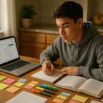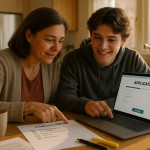Photo Idea : A warm, candid scene of a teen and parent studying at a kitchen table with bilingual textbooks, sticky notes, and a laptop displaying practice questions   evokes family-oriented preparation and cultural continuity.