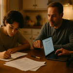 Photo Idea : A calm study scene with a student and parent reviewing a planner and a laptop showing a testing accommodations portal. Natural lighting, warm tones   conveys partnership and planning.