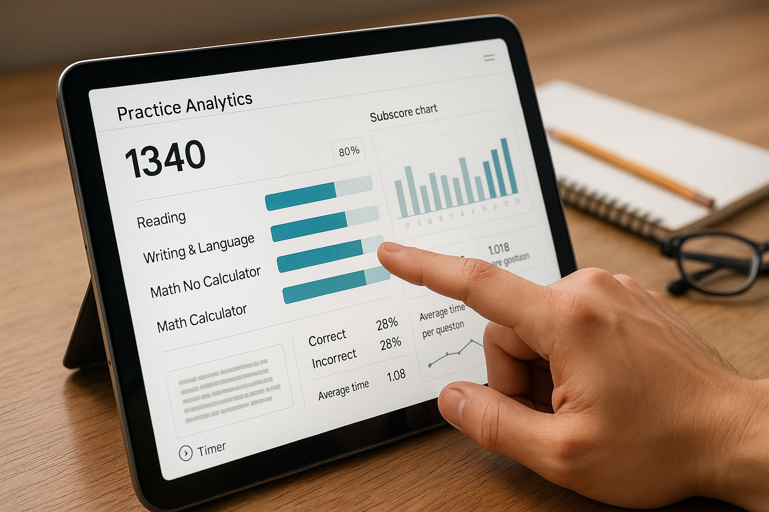 Photo Idea : A close-up of a digital SAT practice interface on a tablet showing question analytics, with a student's hand pointing to a subscore chart.