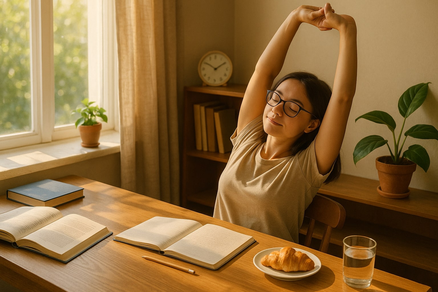 Set a timer and try a simple breathing pattern: 4 seconds inhale, 6 seconds exhale, repeat for 3–5 minutes. This calms an overactive mind, lowers anxiety before an intense section, and can sharpen focus when you return to study.