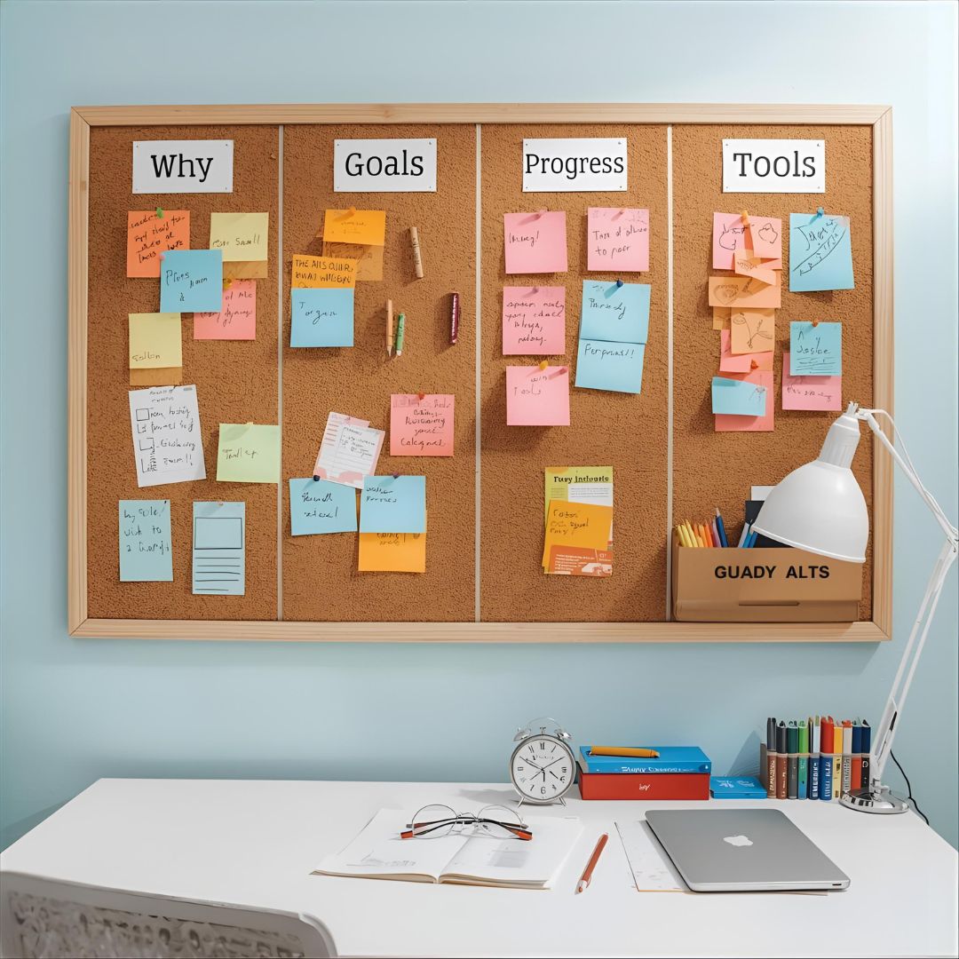 Studying solo is noble, but accountability boosts consistency. Make space on your wall for accountability commitments.