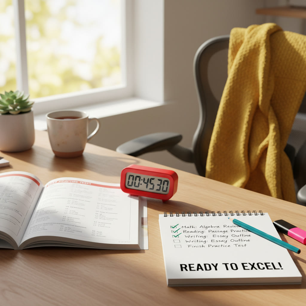 | 6 | Final Review & Confidence | Light review, short timed sections, sleep and nutrition focus | Arrive at test day calm and prepared |