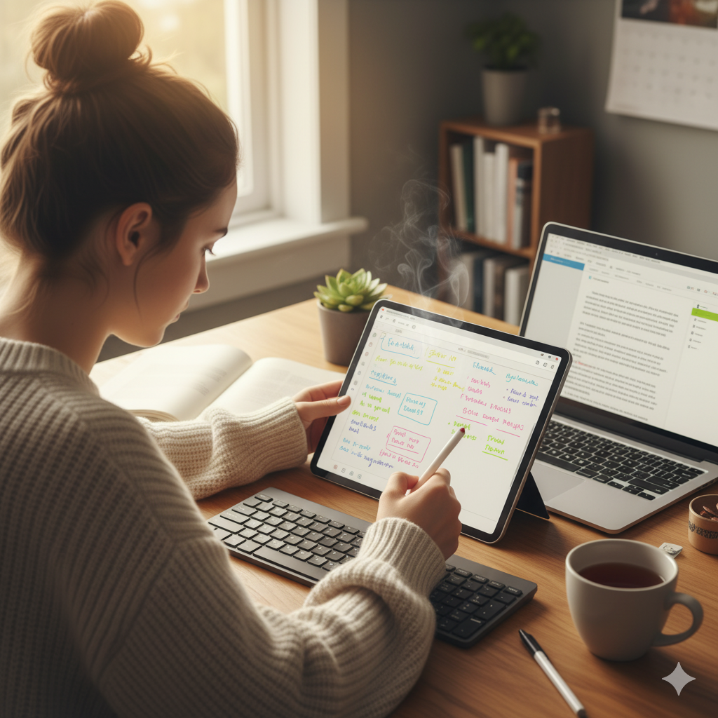 The worst friction in study systems is cognitive: “Where did I put that?” Pick one app to be your source of truth. This is where your study plan, question logs, and spaced‑repetition decks live. Use a second app only for quick captures (pictures of whiteboard work, screenshots from Bluebook, or handwriting on a tablet). Keeping the ecosystem small saves time.