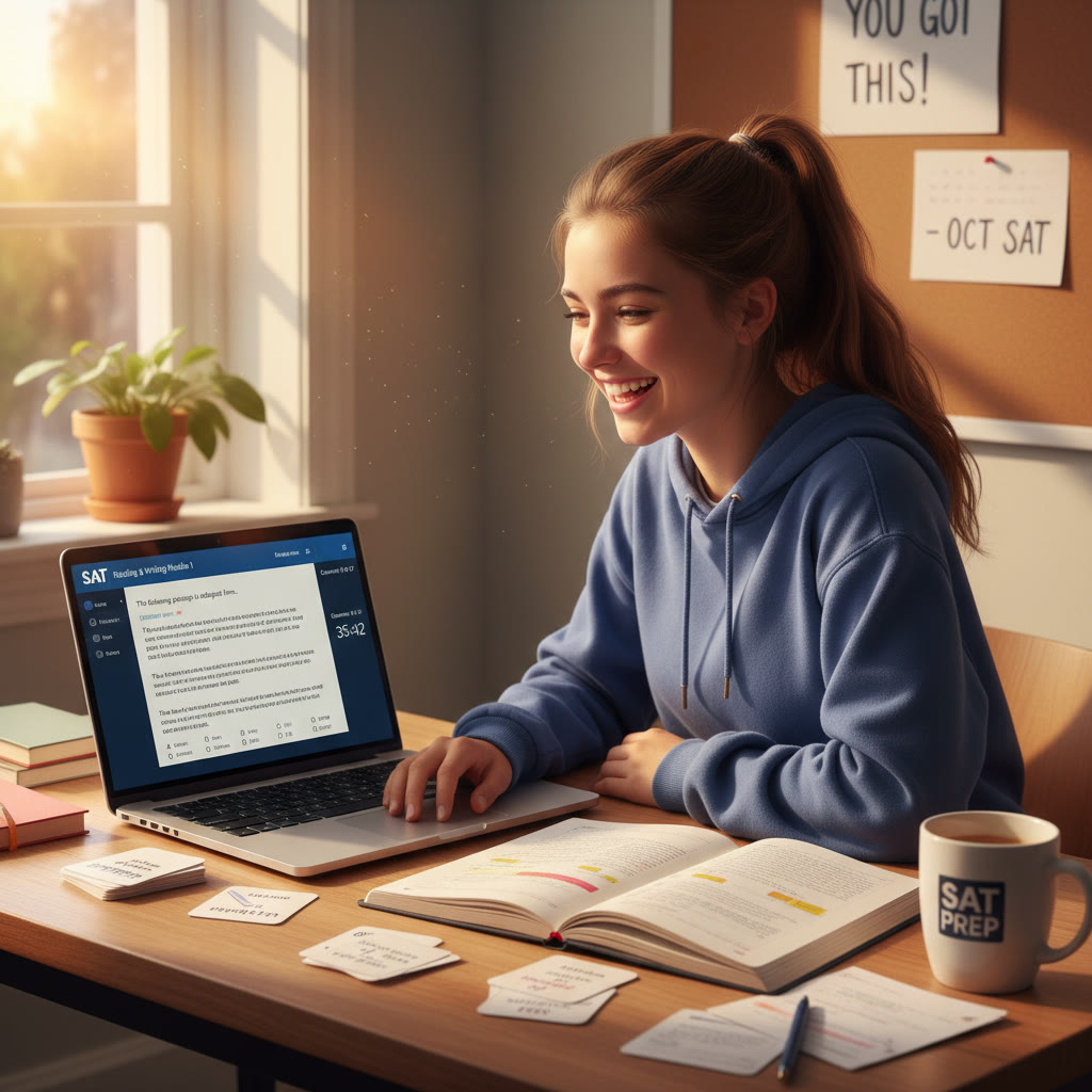 Photo Idea : A focused high-school student at a desk with a laptop open to a practice digital SAT interface, notes around, coffee mug, late-afternoon light.