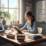 Photo Idea : A candid shot of a high school student studying at a desk with a laptop and practice test papers spread out, sunlight streaming through a window — evokes focused, calm preparation for the Digital SAT.