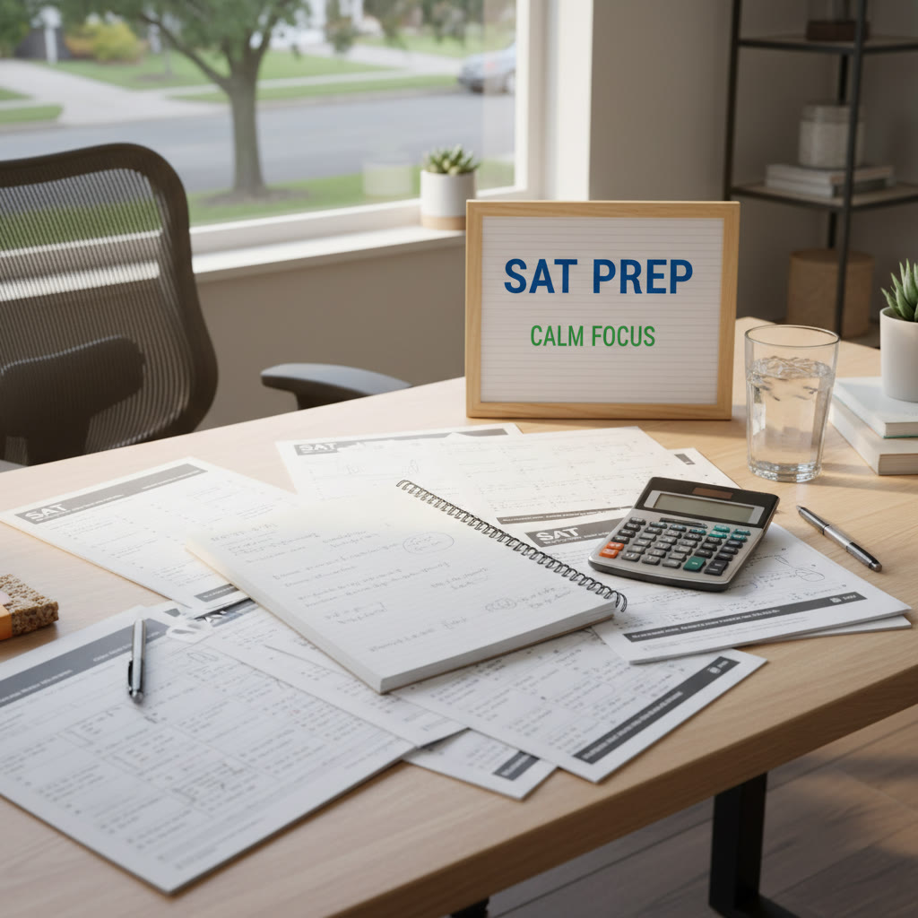Study desk setup for SAT preparation: notebook, scientific calculator, scatter of practice tests, a glass of water, and a low-traffic environment—emphasize calm focus.