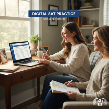 Photo Idea : A student at a desk with a small whiteboard showing a study plan, a laptop with a digital SAT practice screen open, and a cup of tea—captures focused, calm studying.
