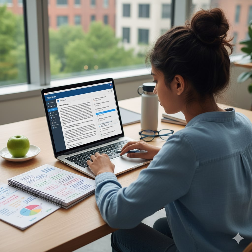 Photo Idea : Student at a simple desk with a laptop running Bluebook, natural light, water bottle, and a small timer — cozy, focused atmosphere.