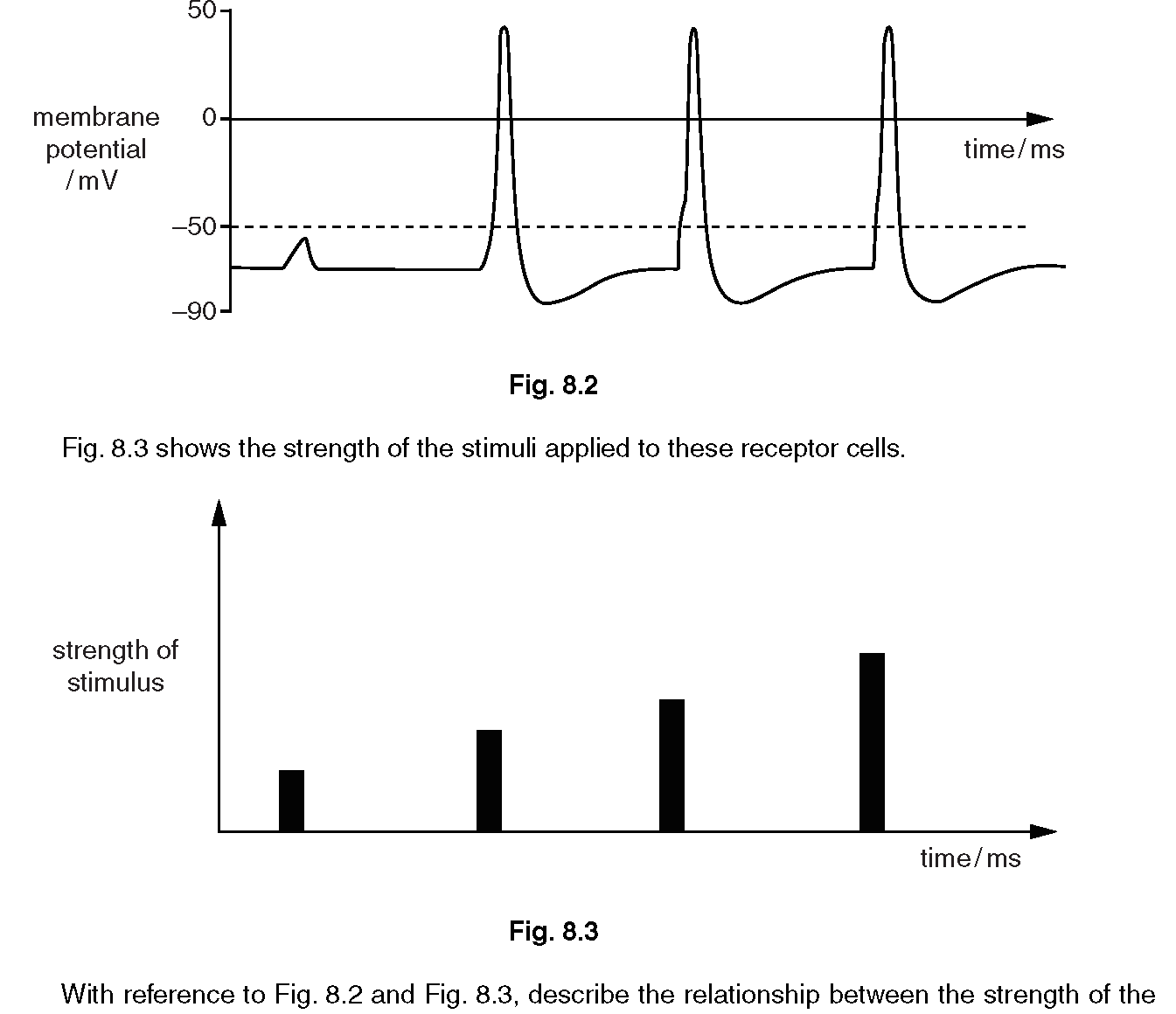 With reference to Fig. 8.2 and Fig. 8.3, describe the relationship between the strength of the stimulus and the resulting action potential. [2]
