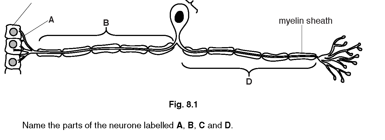 Name the parts of the neurone labelled A, B, C and D. [4]