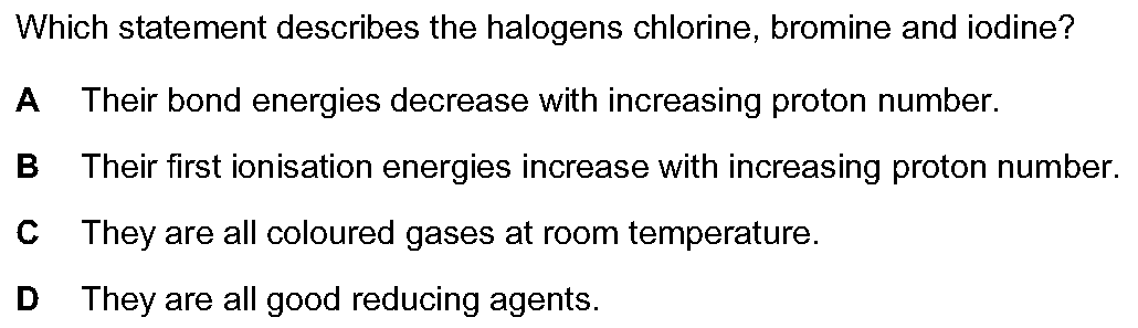 (a) The elements of Group 17 are called halogens. Complete Table 1.1. [Table_1: halogen - colour at 293K; chlorine - ......; bromine - ......; iodine ...