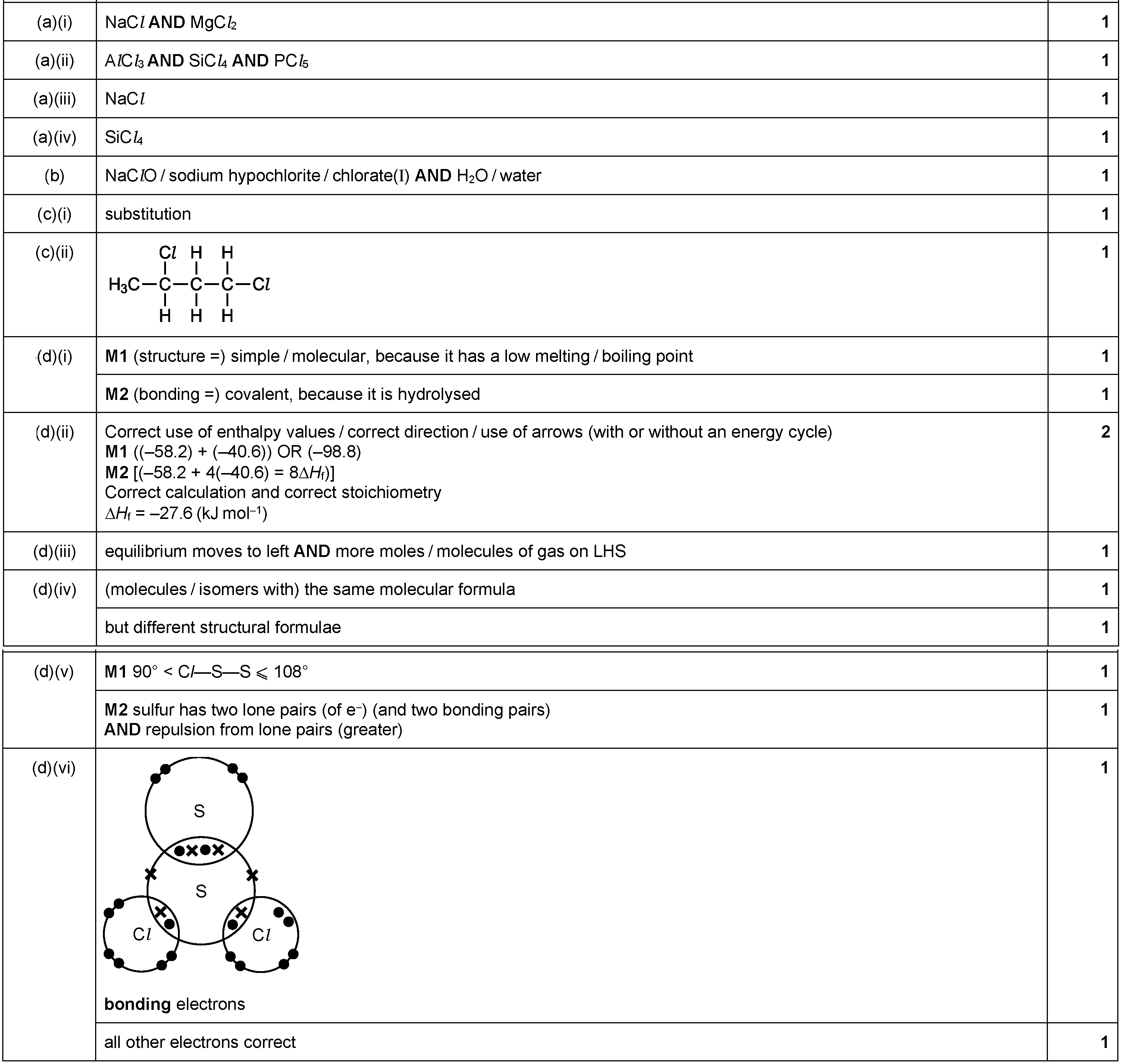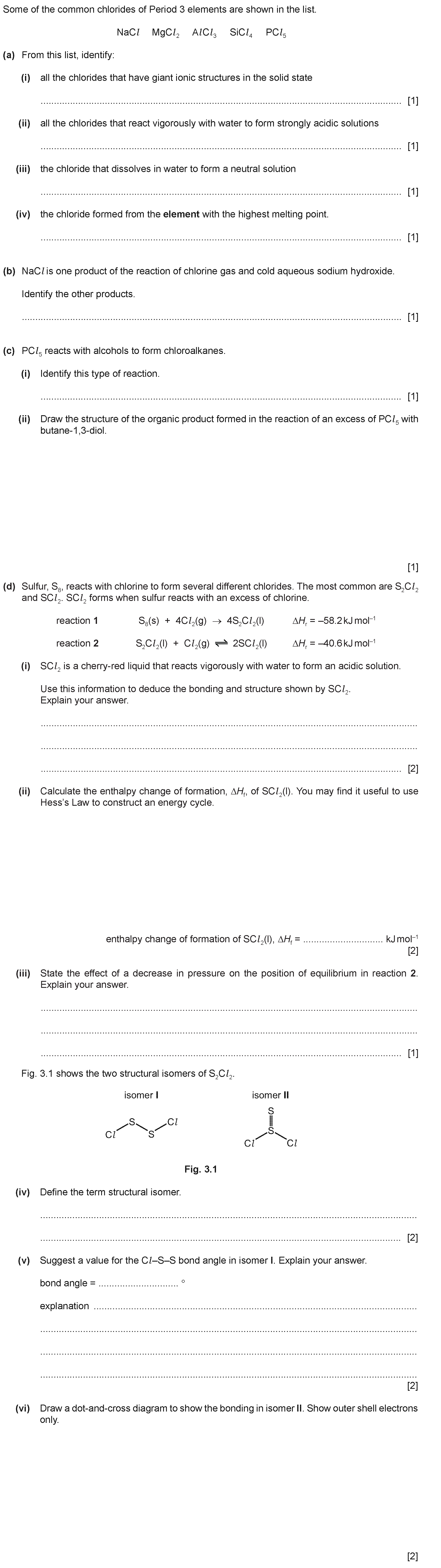 Some of the common chlorides of Period 3 elements are shown in the list.NaCl, MgCl_2, AlCl_3, SiCl_4, PCl_5(a) From this list, identify:(i) all the ch...