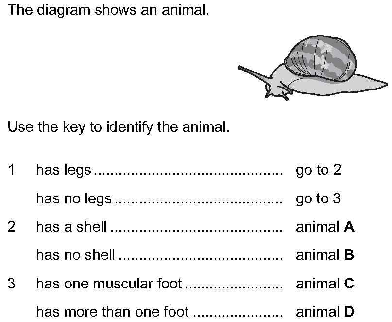 The diagram shows an animal. Use the key to identify the animal.1 has legs ...................................... go to 2 has no legs .................