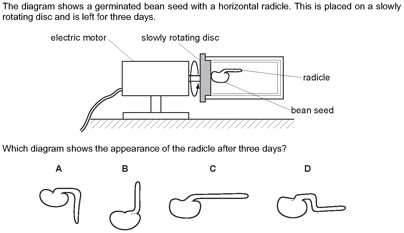 (a) Plants, like animals, respond to stimuli. Tropisms are an example of a plant response.(i) Define the term *geotropism.*..............................