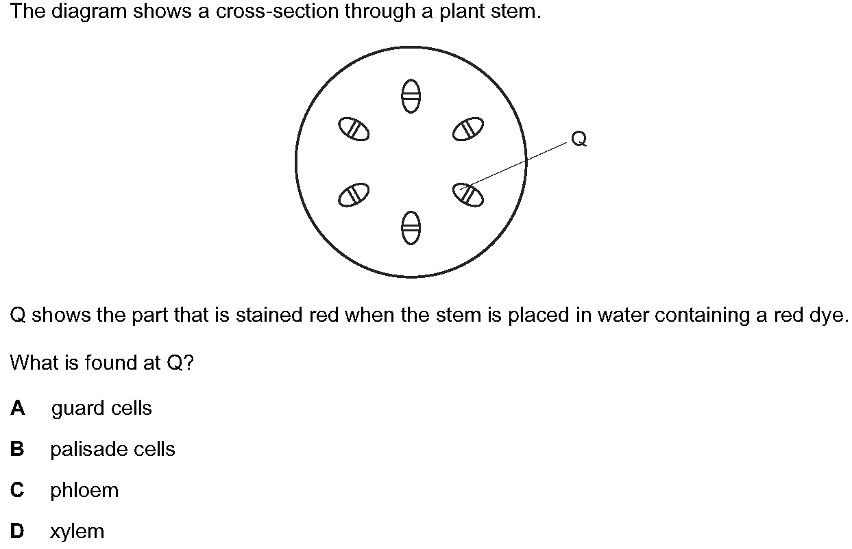 (a) Phloem and xylem are two types of tissue in plants.Fig. 9.1 shows a section through a plant stem, A, and a plant leaf, B.Fig. 9.1(i) Label the phl...