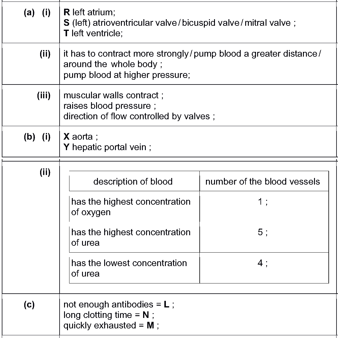 (a) One function of the blood is to transport substances around the body. Complete Table 5.1 to show where some substances may enter and leave the blo...