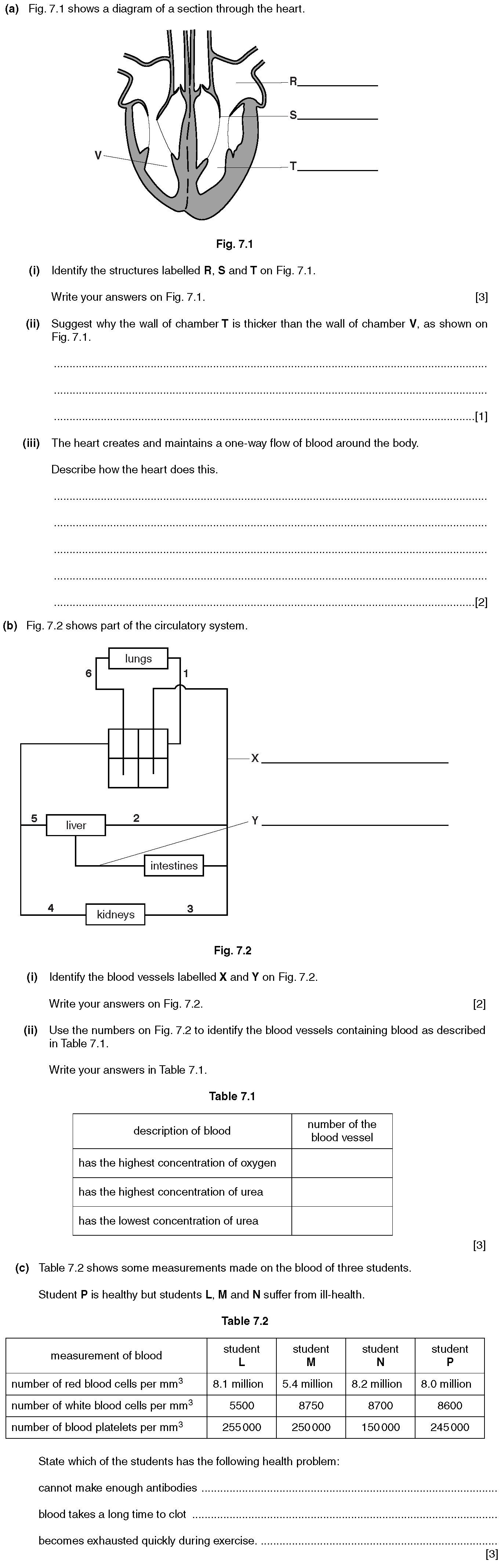 Fig. 8.1 shows a section through the heart. (a) (i) Name the two blood vessels, shown on Fig. 8.1, that carry oxygenated blood. ........................
