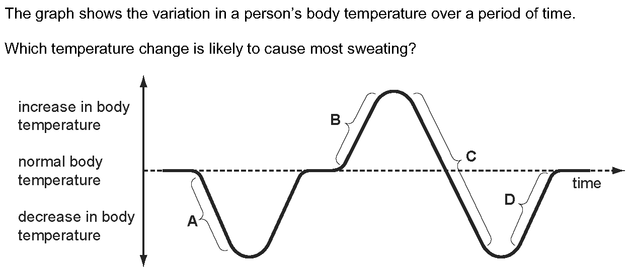 The graph shows the rates of sweat production and urine production at different environmental temperatures.Which statement is correct?A. As the temper...