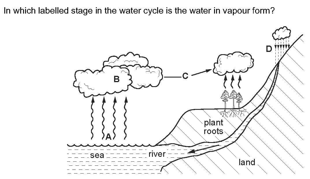 The diagram shows part of the water cycle.Which arrow represents condensation?