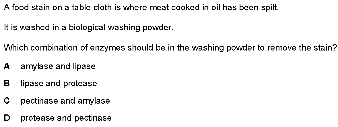 The diagram shows the action of amylase. What is the function of the enzyme amylase?A) breaks down the substrate into amino acidsB) changes the produc...
