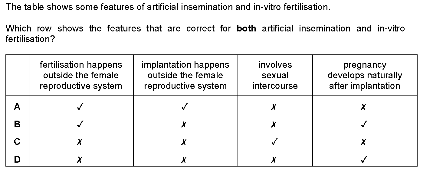The table lists some processes which take place during reproduction in flowering plants and mammals. Which row is correct? [Table_1]