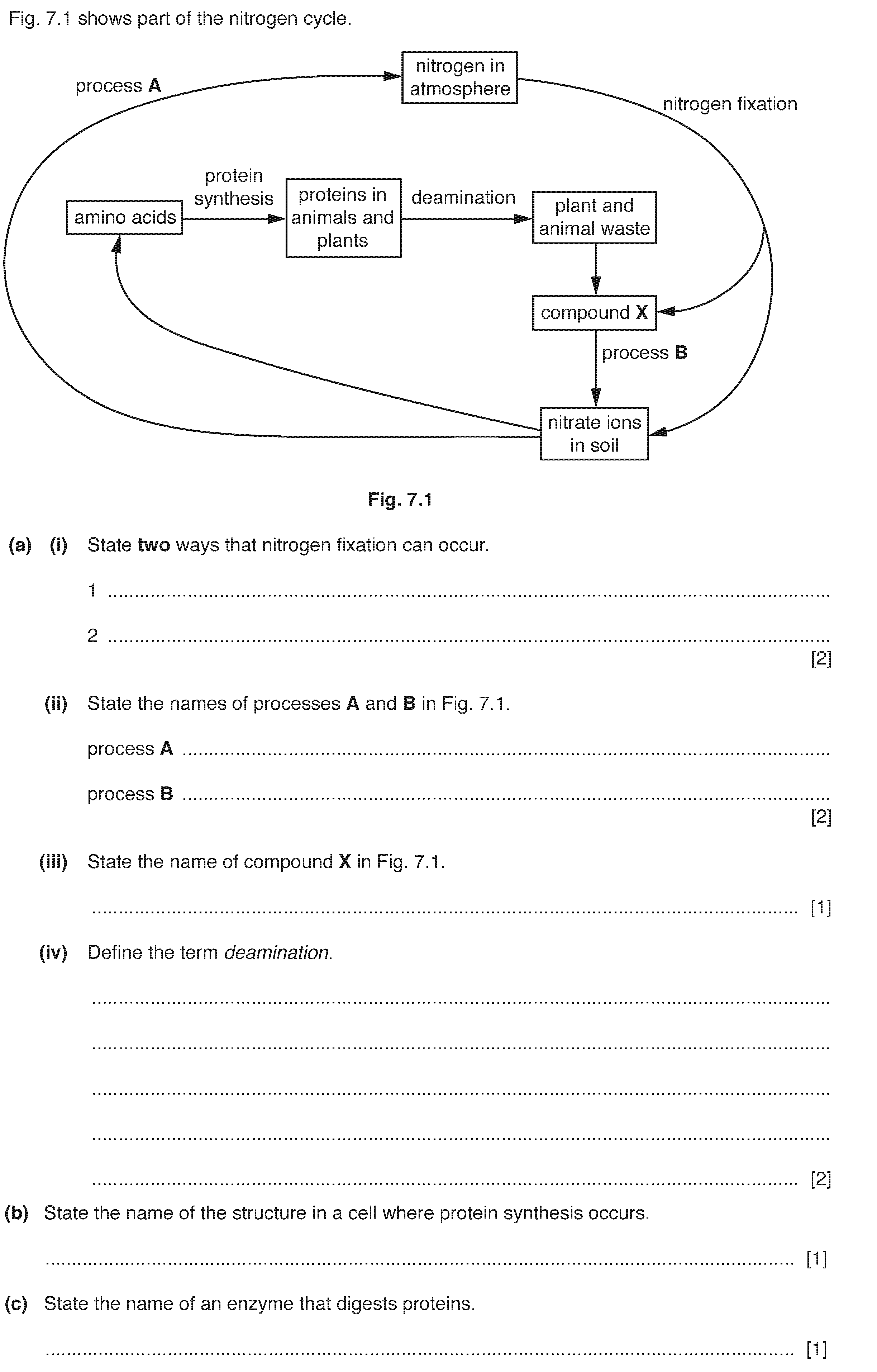 Fig. 2.1 shows part of the nitrogen cycle.(a) Name the processes A and B shown in Fig. 2.1.A ............................................................