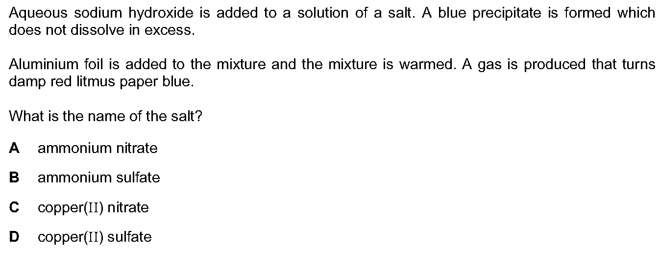 Aqueous sodium hydroxide is added to a solution of a salt. A blue precipitate is formed which does not dissolve in excess.Aluminium foil is added to t...