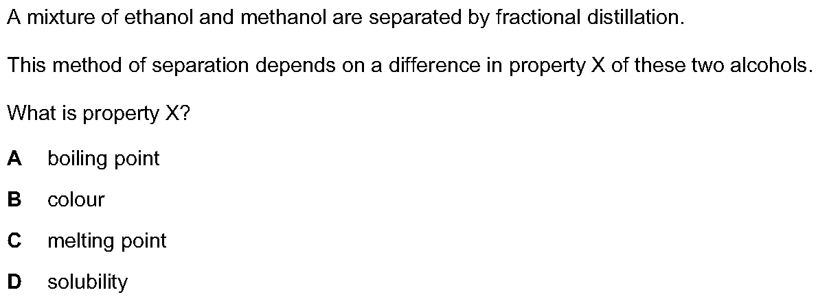 Methanol, CH$_3$OH, and ethanol, C$_2$H$_5$OH, are miscible liquids. Which diagram shows apparatus that is used to obtain methanol from a mixture of ...
