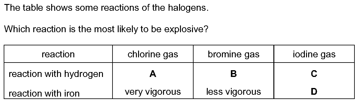 Elements X, Y and Z are in Group VII of the Periodic Table.X is a gas.Y is less reactive than ZZ is a red liquid.When X, Y and Z are put in order of i...